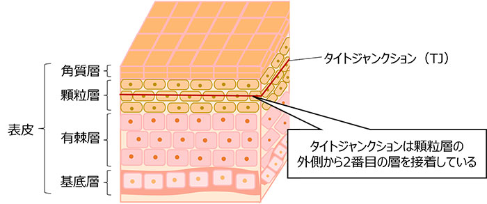 ※1 タイトジャンクションとは、皮膚最表面である表皮を構成する顆粒層に存在し、隣接細胞の間隙を埋める細胞接着装置である。タイトジャンクションが細胞同士を強く接着させることで、皮膚のバリア機能を高め外部からの刺激物の侵入を防いだり、内部からの水分や保湿成分の蒸散を防いだりすることができる。