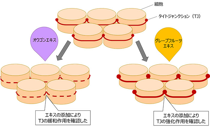 - TJの緩和作用を示すオウゴンエキスとTJの強化作用を示すグレープフルーツエキスの機能性を確認