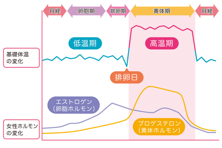 妊娠に関わるホルモン。排卵直後から分泌量が増加し、基礎体温を上げて子宮内膜に受精卵が着床しやすい状態にします。妊娠後は妊娠を継続させる働きを担っています。月経前に食欲が増加したり眠気が強くなったりするのも、プロゲステロンの分泌による影響です。